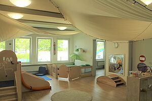 Unser Alltag findet in kindgerecht gestalteten Innenräumen, Funktionsräumen und einem großzügigen Außenbereich statt. Unsere Raum- und Materialgestaltung bietet den Kindern vielfältige Anreize für Wahrnehmungen, Erfahrungen sowie alternative Möglichkeiten zur Bewegung und Aktivität, Ruhe und Entspannung.
